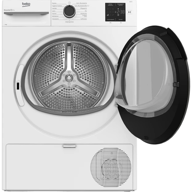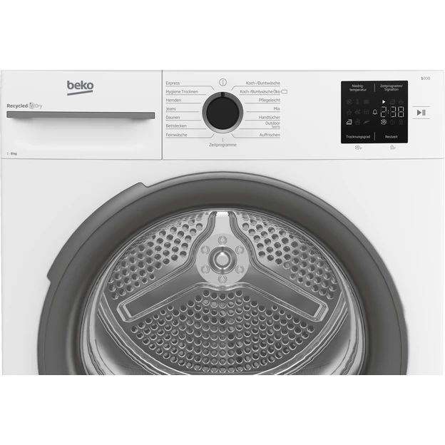 Beko Wärmepumpentrockner mit NX Design, multifunktionales Display mit bis zu 24 Stunden Startverzögerung, voll elektronisch, elektronische Feuchtigkeitsmessung, Edelstahl-Trommel, 8 kg, Energieeffizienzklasse A+, neue Energieeffizienzklasse „E“.
