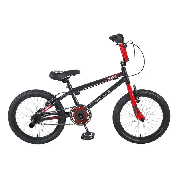 The 18″ wheel Zombie Plague is a superb first junior BMX and comes equipped with everything you need to learn the tricks that will enable you to ‘own’ the local skate park as you get older and move on to a bigger 20″ wheel. It comes complete with bombproof spoked alloy wheels for lightweight performance and a set of stunt pegs that can be mounted in any one of three configurations, so what are you waiting for? Get out riding! Suitable for smaller riders or age 7+ or an inside leg measurement of 18-21 inches.